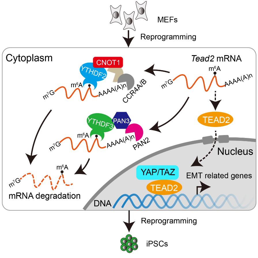该研究利用体细胞重编程为模型,研究m6A结合蛋白YTHDF蛋白家族对细胞命运转变的影响,说明了YTHDF1/2/3在重编程中具有不一样的作用,并证实了YTHDF2和YTHDF3通过不同的RNA降解途径共同调控体细胞重编程,这一研究成果对理解m6A在体细胞重编程等细胞命运决定过程中的功能提供了新视角。