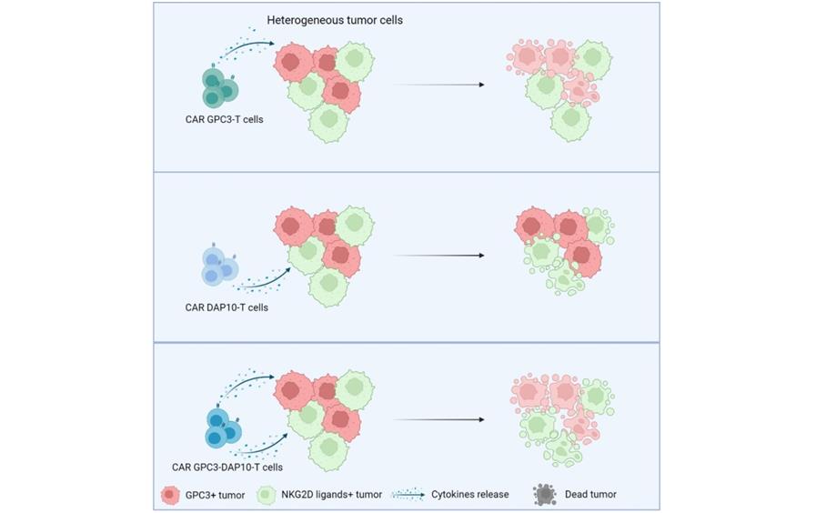 中国科学院再生生物学重点实验室、广东省干细胞与再生医学重点实验室李鹏研究员课题组与暨南大学李扬秋课题组合作,通过在传统CAR分子内引入DAP10分子调动内源NKG2D的广谱抗原识别功能,提升CAR-T细胞对异质性肿瘤的靶向能力。课题组近日在Molecular Therapy – Oncolytics上发表了题为DAP10 integration in CAR-T cells enhances the killing of heterogeneous tumors by harnessing endogenous NKG2D的研究。