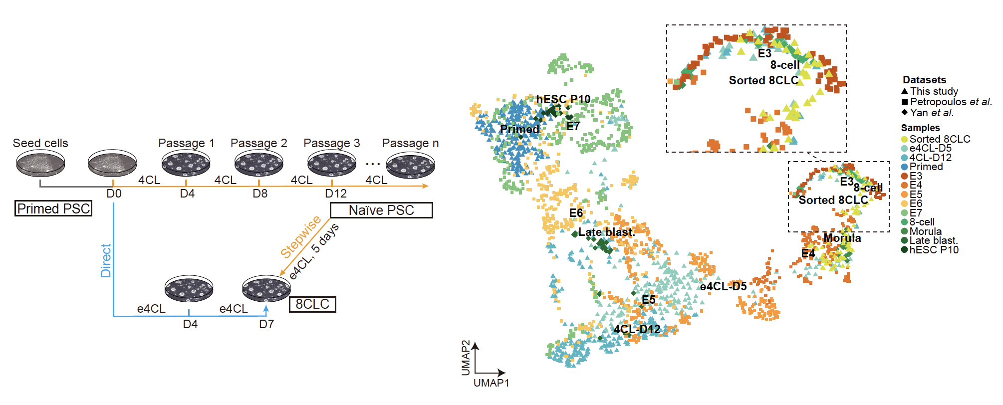Read More>>本报讯(记者张晴丹、朱汉斌)中科院广州生物医药与健康研究院Miguel A. Esteban研究组开发了一种非转基因、快速且可控的重编程方法,将人多能干细胞(PSC)诱导为全能性的8细胞期胚胎样细胞(8CLC)。相关论文成果近日发表于《自然》。研究人员运用单细胞测序技术,分析确定了8CLC与人8细胞期胚胎的高度相似性,描绘了转化过程的关键分子事件和基因调控网络,并进一步评估了8CLC的分化能力。